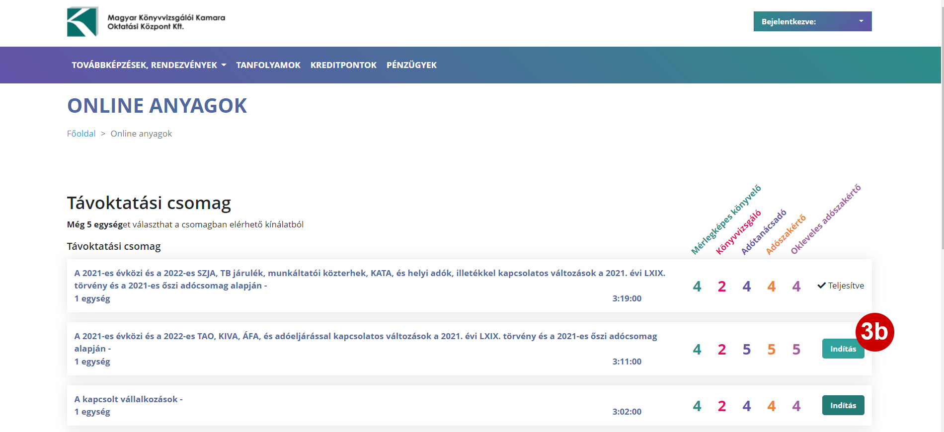 A megtekinteni kívánt előadást az "Indítás" gombbal éri el (3b). Ezt követően néhány másodperc elteltével a távoktatási videó saját oldalára irányítja önt a rendszer.