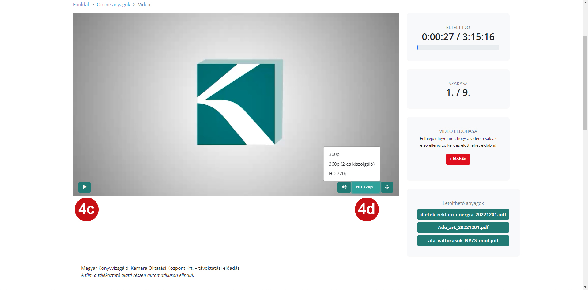 4. A távoktatási videó oldalán a lap felső részén található maga a videó (4a), alatta a továbbképzési program részletes adatai szerepelnek (4b). Az előadás a "Videó indítása" gomb lenyomására indul el.