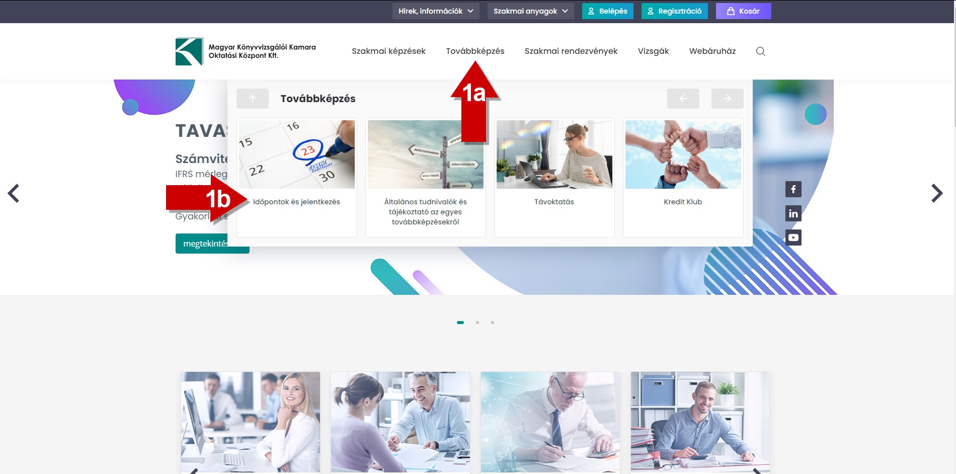 1. Továbbképzéseinkre, így a távoktatási képzésre is, honlapunkon keresztül online jelentkezhet a Továbbképzés fülre (1a) kattintva. A menüpont kiválasztása után kattintson az Időpontok és jelentkezés fülre (1b) ahol teljes továbbképzési kínálatunkat (tantermi képzések országosan, valamint távoktatási lehetőségek) megtekintheti a szűrés panel (1c) alatt kezdődő listában (1d).